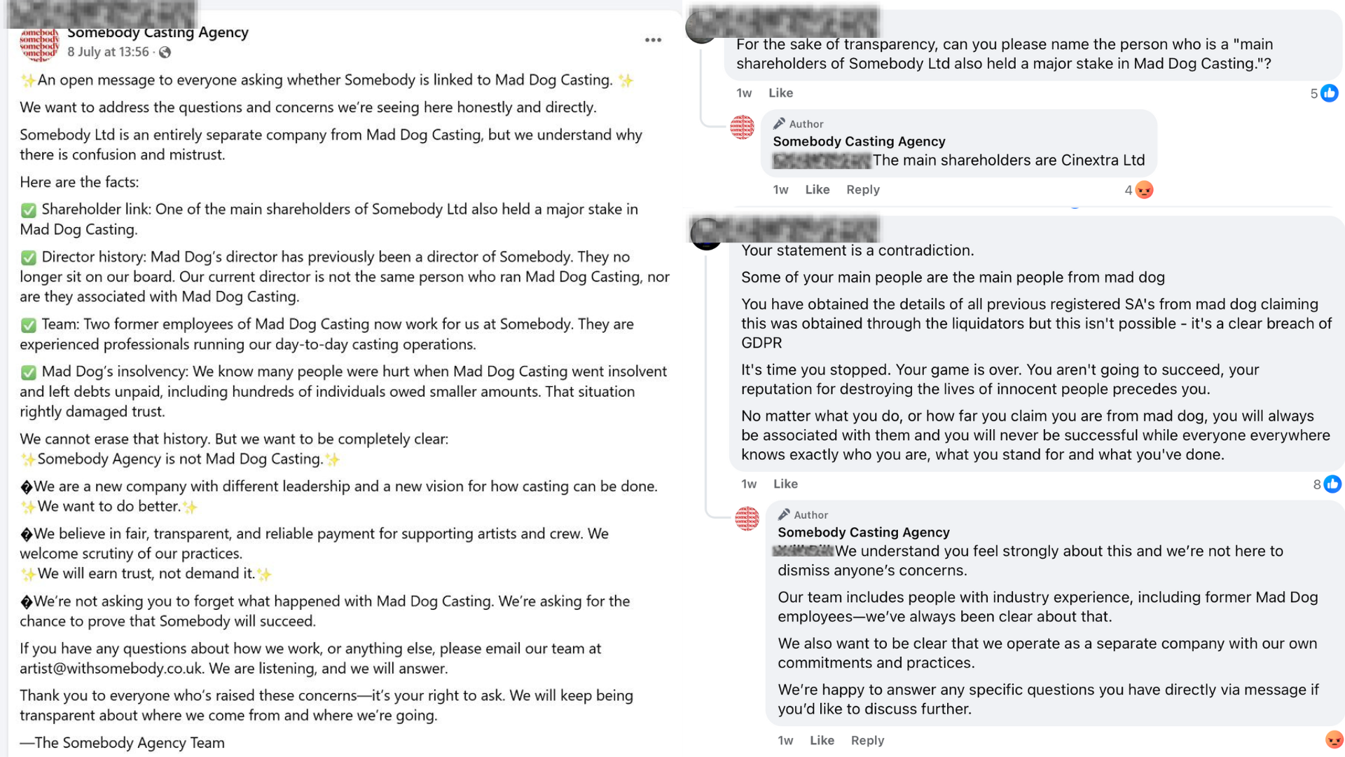 In the case of Mad Dog and Somebody, Equity has explicitly called this phoenixing and demanded regulatory intervention. The evidence suggests that ‘Somebody Casting’ are the same players in a new disguise.